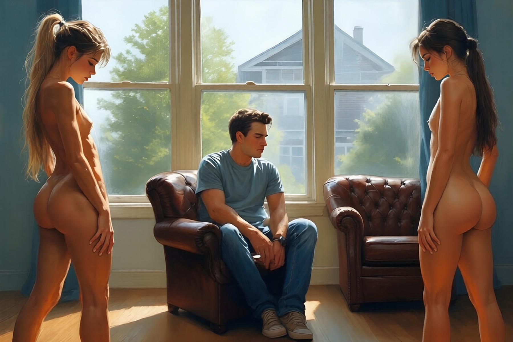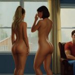 The overall theme of this post: two sister cuties standing with reddened behinds in front of their “daddies” after receiving through spankings. Trying to clear out previously made art, which is good enough to post.